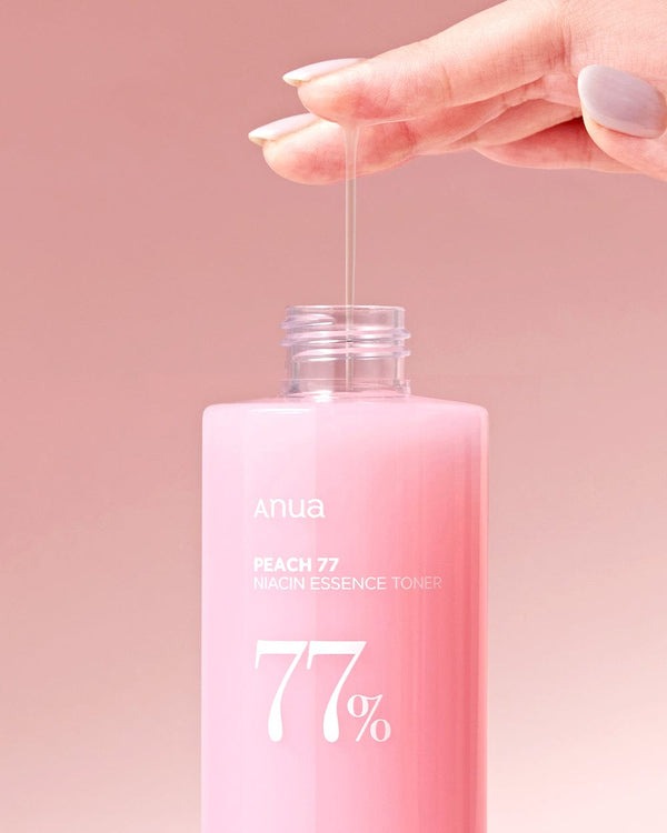 Το Anua Peach 77 Niacin Essence Toner με ροδάκινο απολεπίζει απαλά την κεράτινη στιβάδα, μαλακώνει και λειαίνει και προετοιμάζει τέλεια την υφή του δέρματος για το μακιγιάζ. Έχει παχύρρευστη υφή gel, αφήνει ένα υγρό τελείωμα, και δίνει το άρωμα μαύρου τσαγιού με ροδάκινο.